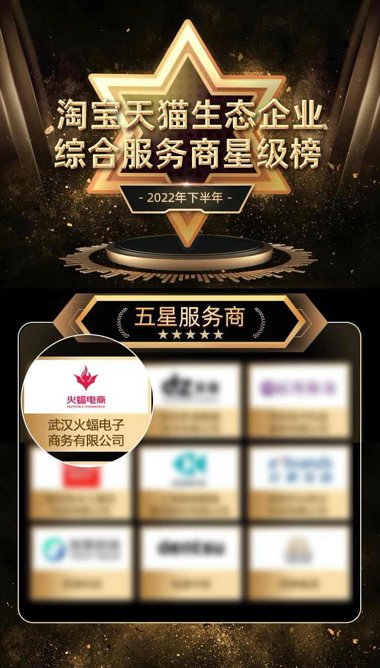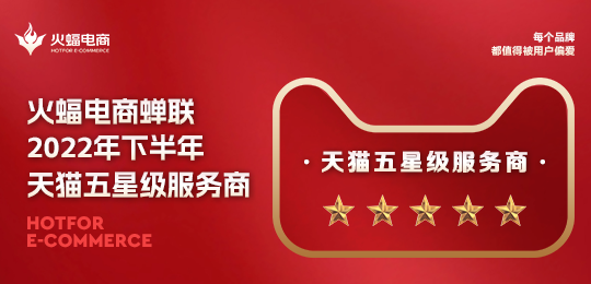 近日,2022年下半年淘寶天貓生態(tài)企業(yè)評級評優(yōu)榜單正式發(fā)布,火蝠電商憑借專業(yè)的精細化運營服務(wù)能力與優(yōu)質(zhì)的數(shù)字化經(jīng)營能力,再次榮獲綜合服務(wù)商星級榜五星級服務(wù)商。