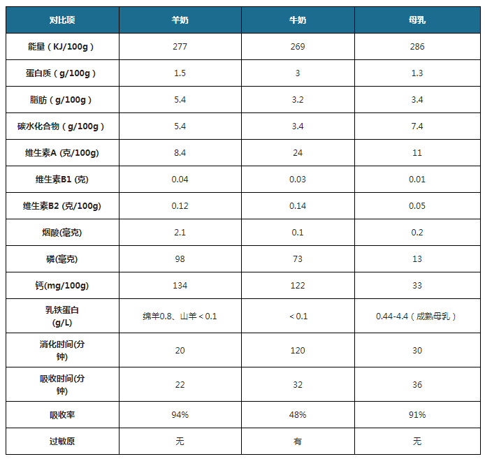 ▲羊奶和牛奶的營養數據對比,圖片來自于網絡