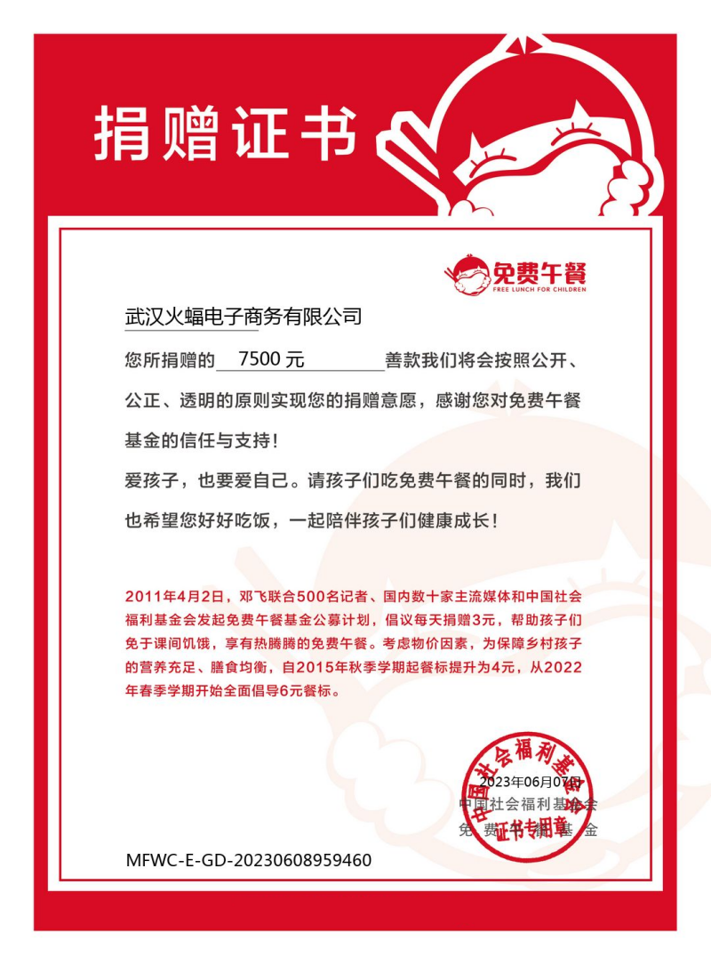 在全體成員的愛心支持下,火蝠電商共籌集了7500元愛心基金,此筆基金也將全部用于貧困山區(qū)小孩的午餐中,讓愛傳遞到他們的每一個角度,讓他們不用再餓著肚子去探索知識的殿堂,讓他們有機會去見識外面廣闊的天地。每個人的力量或許微小,當我們所有人的力量聚合起來,我們改變的將是整個世界,這也正印證了“火蝠公益基金會”的初心。